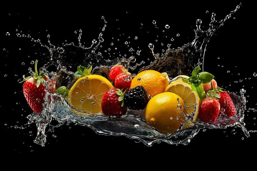 Wandbilder Eine Gruppe von Früchten, die ins Wasser platschen
