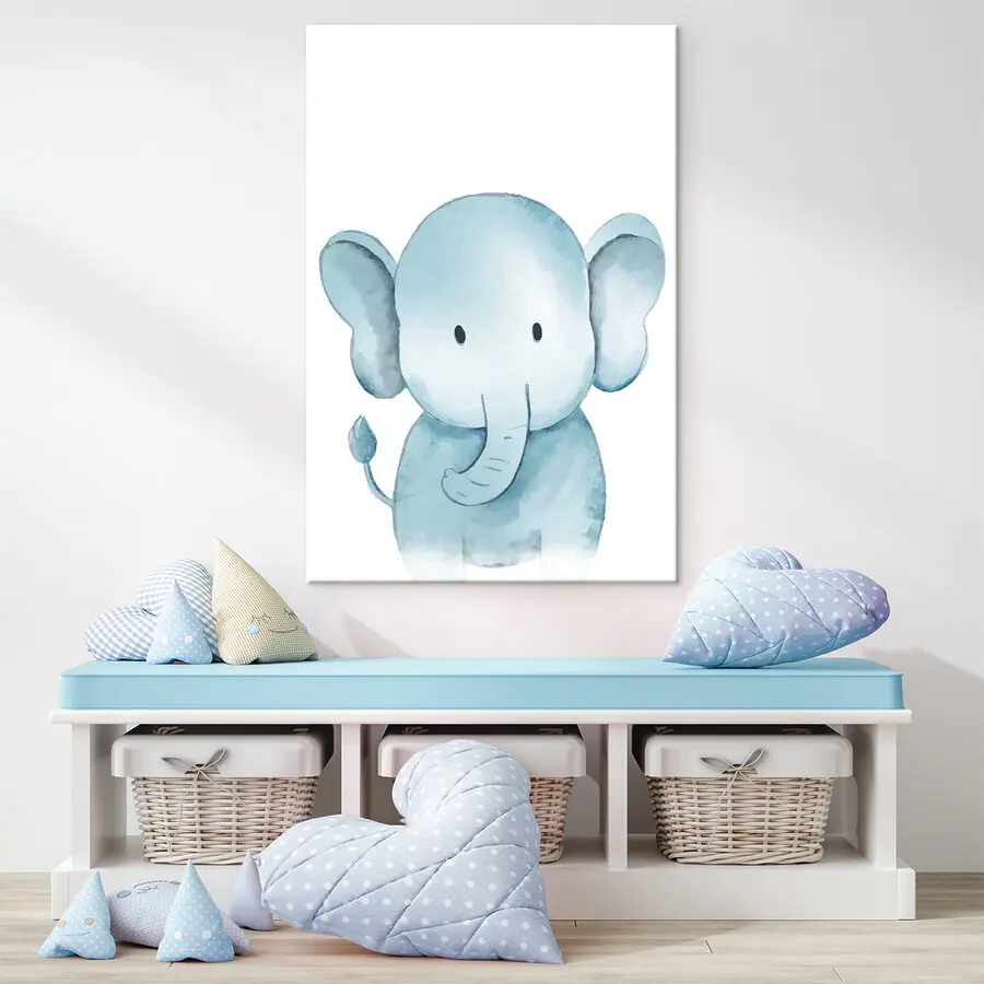 Sehen Sie sich dieses bezaubernde Leinwandbild mit einem Cartoon-Elefanten an! Dieses Kunstwerk ist ideal für Kinderzimmer oder um jedem Raum einen Hauch von Laune zu verleihen und wird Sie jedes Mal zum Lächeln bringen, wenn Sie es sehen. Stellen Sie sich vor, wie dieser fröhliche kleine Elefant das Zimmer Ihres Kindes erhellt - Sie können das Kichern förmlich hören! Die sanften Pastellfarben erwecken diesen Cartoon-Elefanten auf sanfte, verträumte Weise zum Leben. Stellen Sie sich vor, wie Sie unter seinem wachsamen Auge Gute-Nacht-Geschichten erzählen oder morgens mit diesem niedlichen Wesen kuscheln. Ob in Kombination mit anderen Tiermotiven oder allein, dieser kleine Elefant vermittelt ein Gefühl von Freude und Ruhe. Er eignet sich perfekt, um ein Spielzimmer, ein Kinderzimmer oder sogar Ihr eigenes Büro zu verschönern, wenn Ihnen der Sinn nach Verspieltheit steht. Es ist ein entzückendes Detail, das einfach funktioniert, wissen Sie? Es ist, als hätte man immer ein freundliches Gesicht dabei, und wer braucht das nicht?