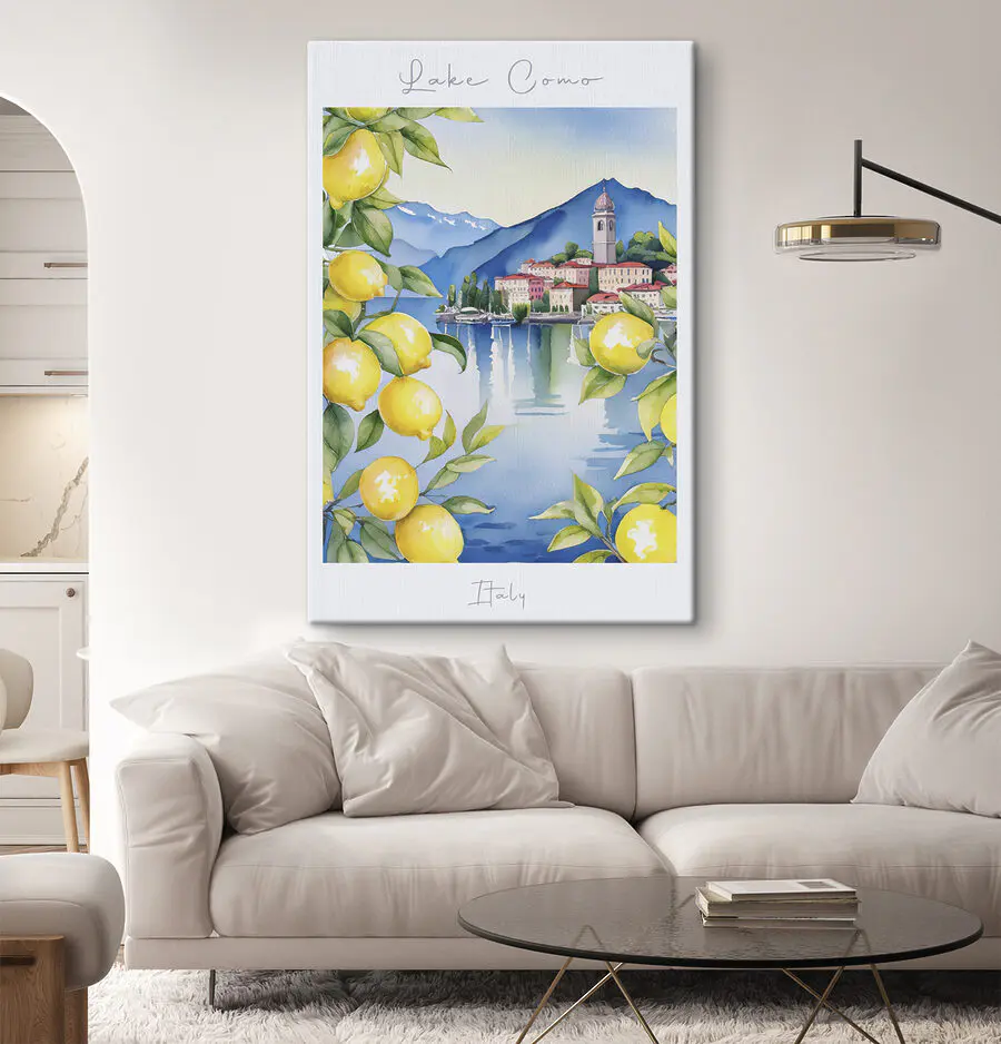 Dieses bezaubernde Aquarell mit einer bezaubernden Stadt vor der Kulisse atemberaubender Berge, umgeben von leuchtend gelben Zitronen, bringt jede Wand zum Strahlen. Es ist wie ein kleines Stück Comer See direkt in Ihrem Zuhause! Stellen Sie sich vor, Sie schlürfen eine Limonade, während Sie diese reizvolle Szene betrachten. Die beruhigenden Blautöne des Wassers vermischen sich perfekt mit den frischen Gelb- und Grüntönen - ein wahrer Stimmungsaufheller! Perfekt für die Küche oder das Wohnzimmer, bringt es einen Hauch von italienischem Flair und einen Hauch von frischer Luft. Fangen Sie das Gefühl ein, über einen sonnigen Marktplatz zu schlendern - mit nur einem Blick!