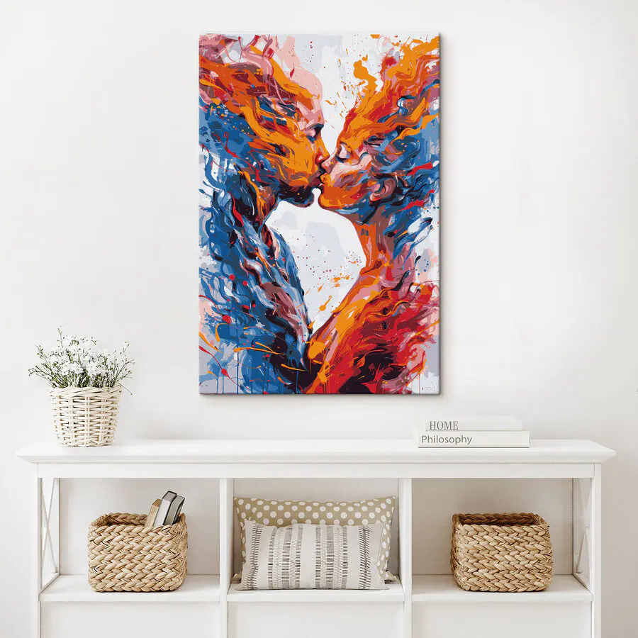 Dieses faszinierende Kunstwerk, "Ein Mann und eine Frau küssen sich", fängt die raue, elektrische Verbindung zwischen zwei Menschen ein. Es ist abstrakt und doch so lebendig, voller wirbelnder Farben und leidenschaftlicher Energie. Stellen Sie sich dieses Bild an Ihrer Wand vor - jedes Mal, wenn Sie daran vorbeigehen, ist es wie ein Ausbruch von Emotionen, der Sie an die Intensität der Liebe und des Lebens erinnert. Es ist perfekt, um Ihrem Wohn- oder Schlafzimmer einen Hauch von Drama und Wärme zu verleihen. Die Mischung aus feurigen Rottönen und kühlen Blautönen macht es zu einem auffälligen Stück, das Gespräche und Bewunderung auslöst. Kennen Sie das Gefühl, wenn Sie nicht mehr wegsehen können? Ja, genau so eines. Ideal für alle, die Kunst mit einer Prise Romantik und einem Spritzer leuchtender Farben kombinieren möchten!