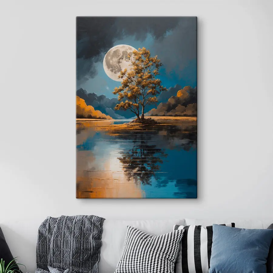 Wandbilder Baum auf einem See mit Vollmond im Hintergrund
