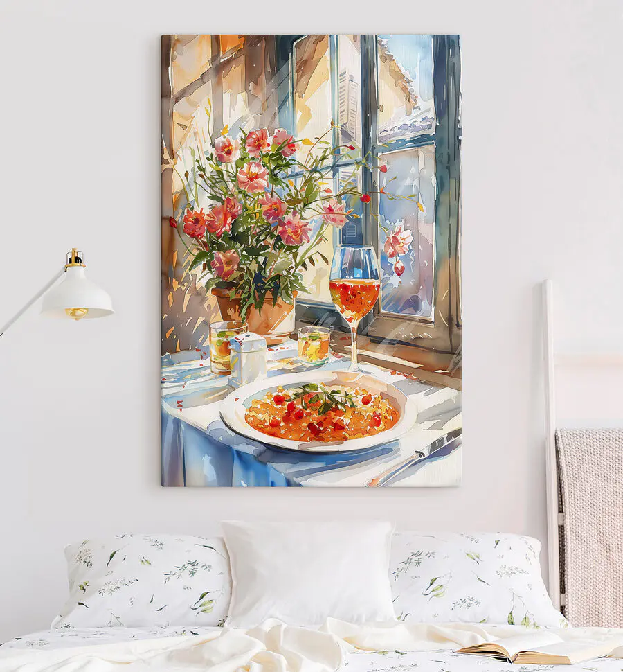Wandbilder Aquarellmalerei eines Tisches mit Essen und Blumen