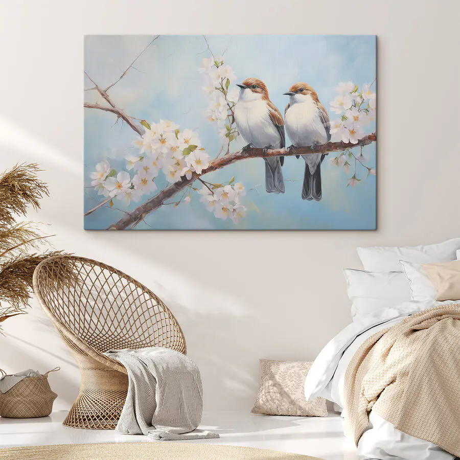 Wandbilder Zwei Vögel auf einem Zweig mit weißen Blumen