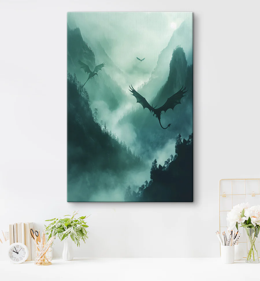 Stellen Sie sich eine Szene vor, in der Drachen mühelos durch einen nebligen Himmel gleiten - majestätisch und ein wenig geheimnisvoll. Dieser Leinwanddruck mit einer fesselnden Gruppe dieser Fabelwesen bringt das Gefühl von Abenteuer direkt in Ihr Zuhause. Stellen Sie sich dieses eindrucksvolle Werk über einer gemütlichen Sitzecke oder einem modernen Büro vor. Es regt die Fantasie an und lädt zu Tagträumen von epischen Schlachten oder heiteren Flügen über bezaubernde Landschaften ein. Die tiefen Farbtöne und die ätherische Stimmung schaffen eine Atmosphäre, die sowohl beruhigend als auch aufregend ist. Jedes Mal, wenn man es ansieht, gibt es einen kleinen Nervenkitzel, eine Erinnerung daran, dass es Magie im Alltäglichen gibt. Es ist perfekt für Tier- und Naturliebhaber, denn es ist wie ein Fenster in eine wundersame Welt. Wer hätte nicht gerne einen Drachen oder zwei, die Wache halten?