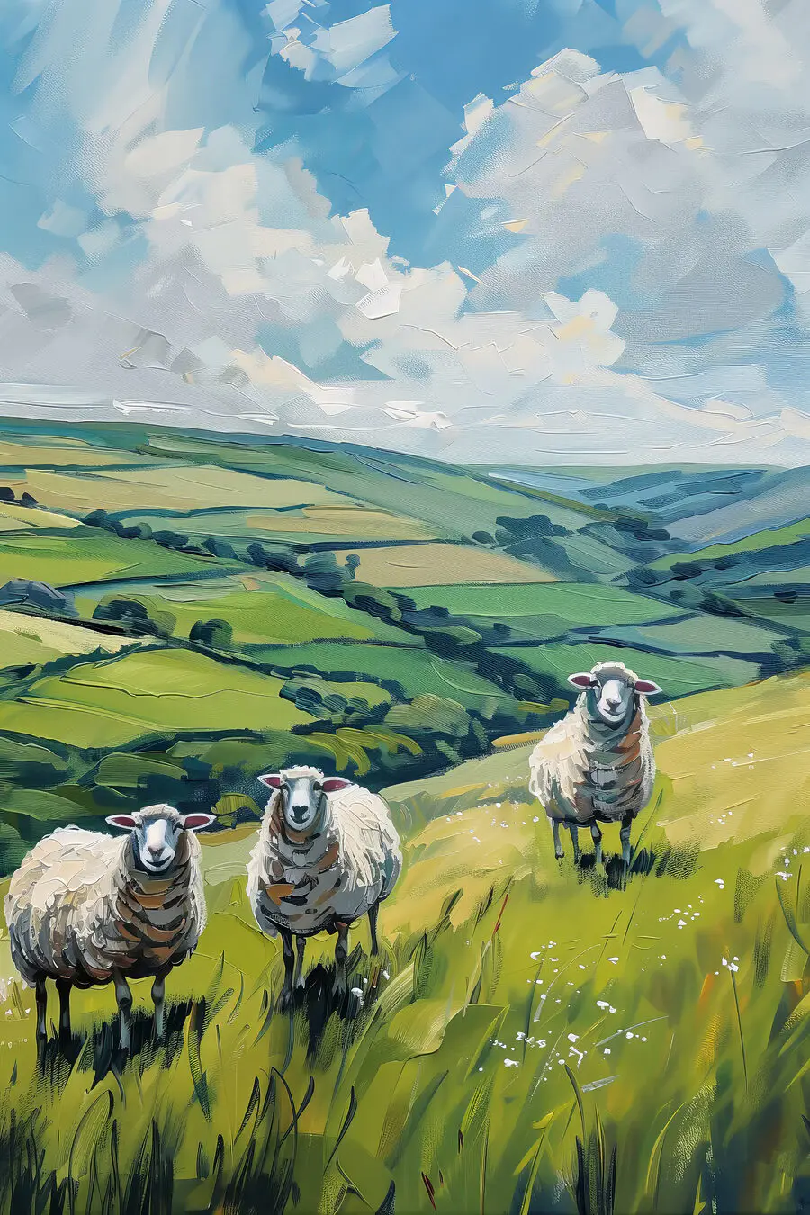 Wandbilder Gruppe von Schafen auf einem grasbewachsenen Hügel