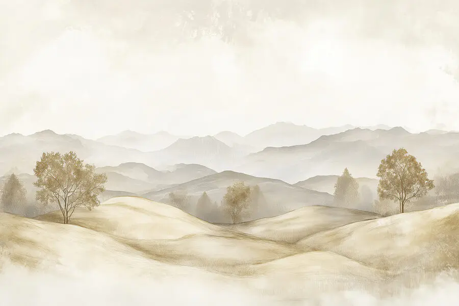 Wandbilder Hügellandschaft mit Bäumen und Bergen im Hintergrund