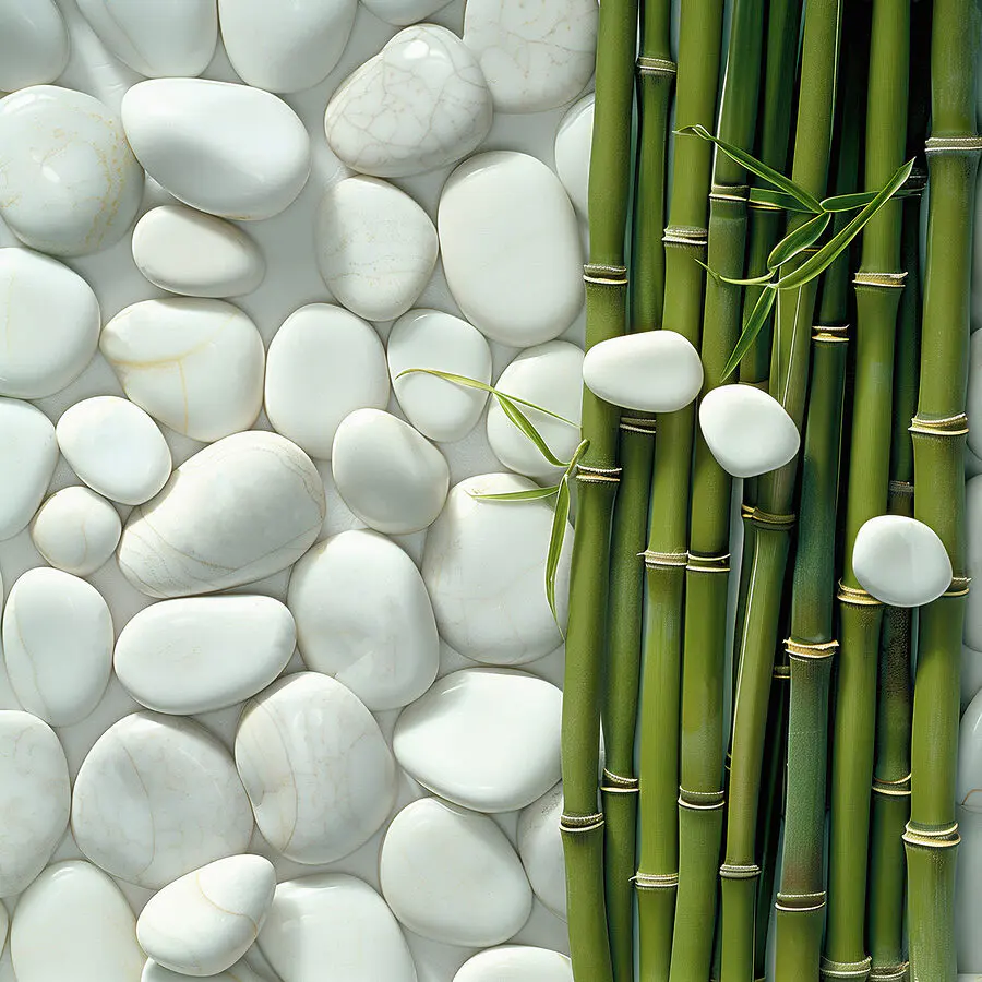 Wandbilder Gruppe von grünen Bambusstämmen und weißen Felsen