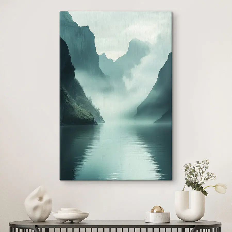 Wandbilder Wasserfläche mit Bergen und Nebel