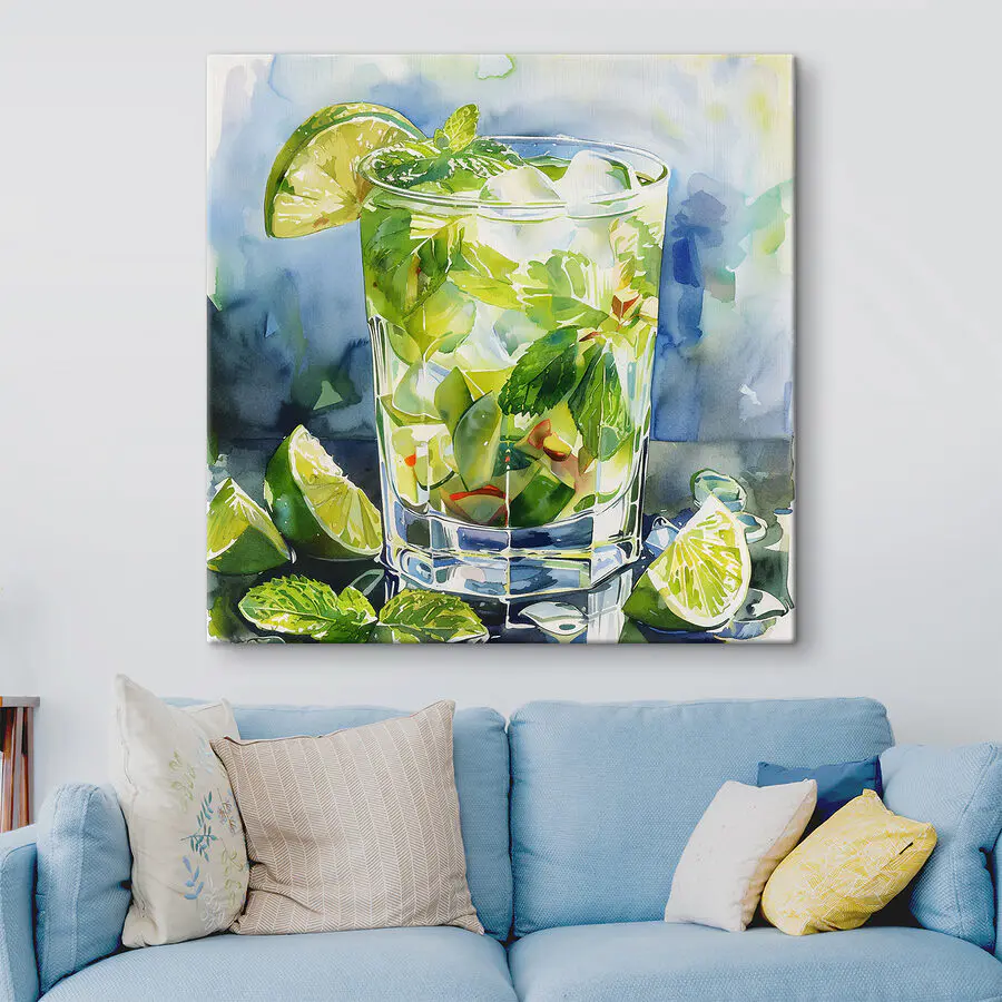 Imagine this: a splash of watercolor magic on your wall that practically quenches thirst. This canvas print showcases a refreshingly zingy glass of water with limes and mint leaves, offering a mini-vacation every time you glance its way. It’s like having a bit of nature’s cocktail party in your living room—no RSVP needed. Perfect for foodie art lovers or anyone needing a visual sip of serenity. A delightful mix of vibrant greens, it brings a sense of calm and fun, just like a lazy summer afternoon. Cheers to that!