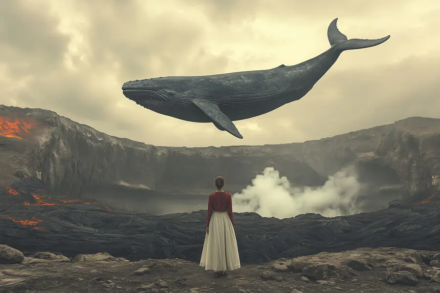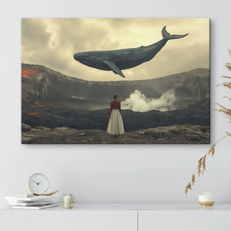 Wandbilder Frau betrachtet einen Wal, der über einen Vulkan fliegt