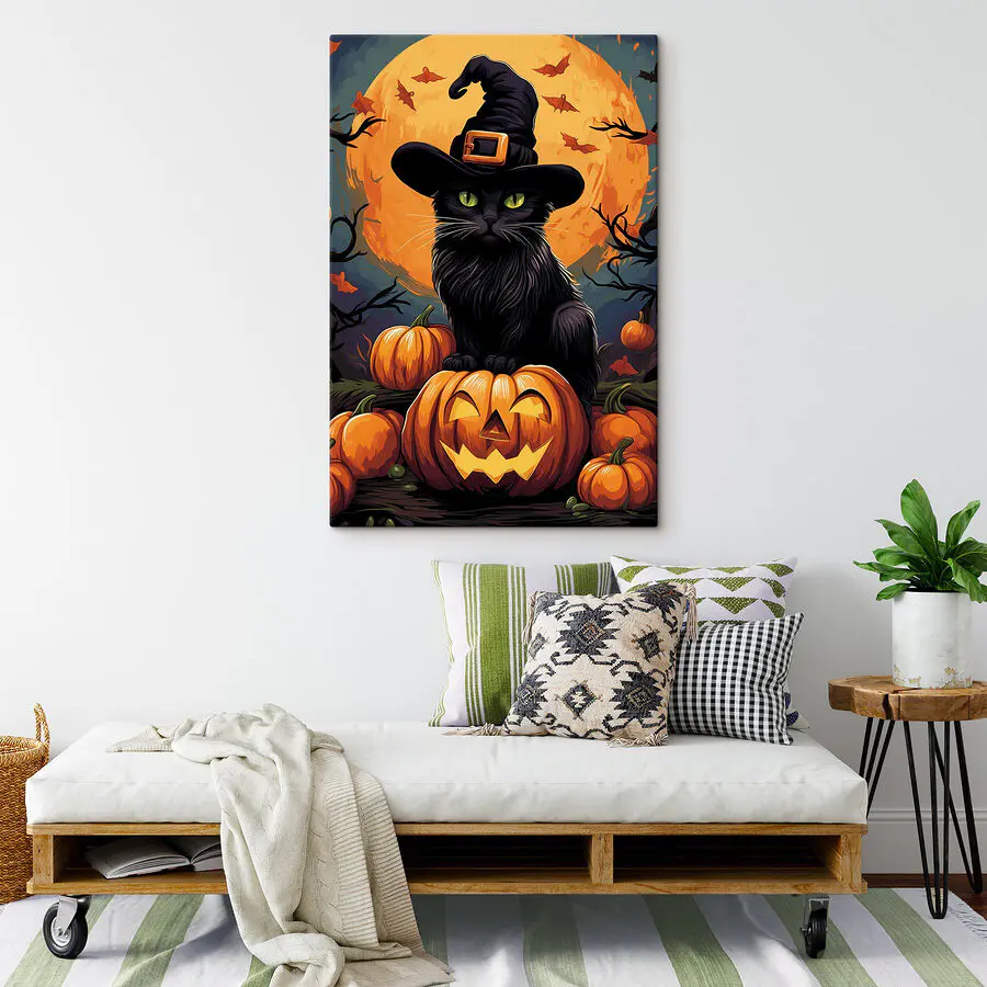Wandbilder Katze mit Hut und auf einem Kürbis sitzend
