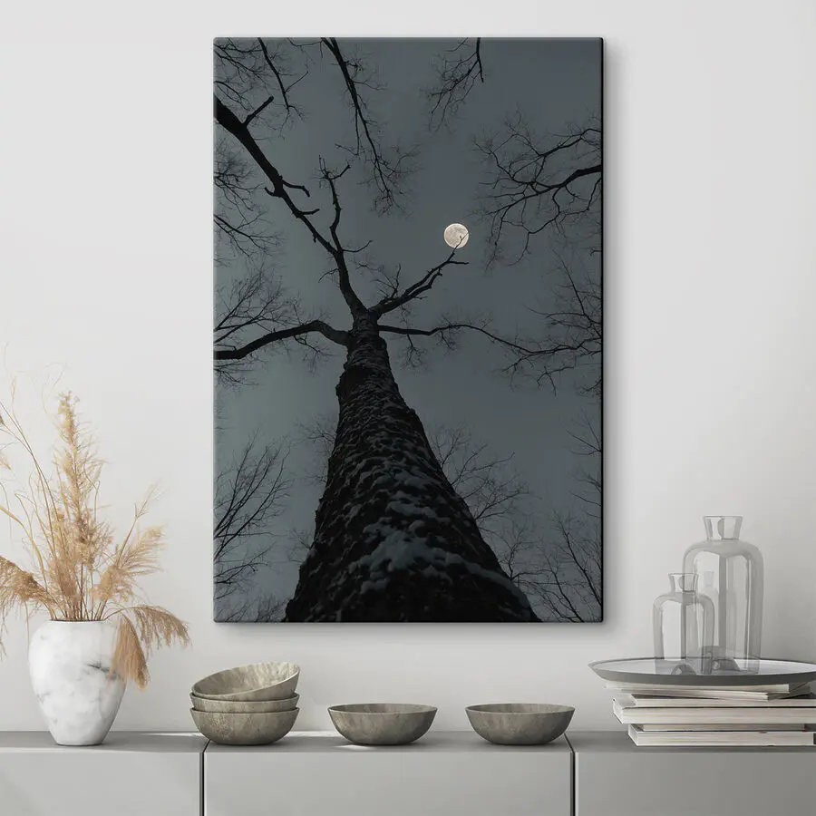 Stellen Sie sich vor, Sie blicken auf diesen atemberaubenden Leinwanddruck eines Baumes, der sich nach dem Mond ausstreckt, als wolle er den Sternen süße Töne zuflüstern. Die kühlen Farbtöne und filigranen Details fangen die stille Magie eines mondbeschienenen Waldes ein. Es ist perfekt für jeden, der davon träumt, es sich mit einem guten Buch vor dem Kamin gemütlich zu machen, oder der einfach einen Hauch von Natur im Haus braucht. Hängen Sie es im Wohnzimmer auf, und beobachten Sie, wie die Gäste stehen bleiben und es bewundern. Es bringt ein wenig Dramatik ins Spiel, ohne nach Aufmerksamkeit zu schreien - genau wie eine gut platzierte Prise Salz auf einem Gericht. Perfekt für Tagträumer und Naturliebhaber gleichermaßen!