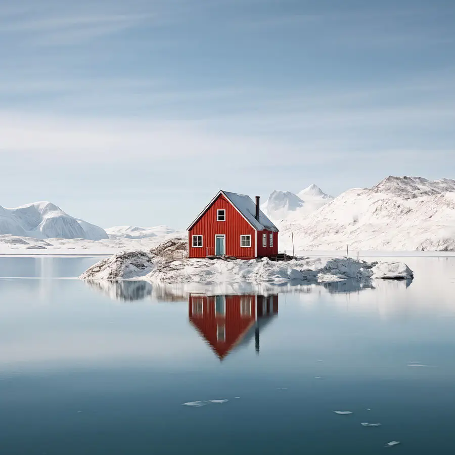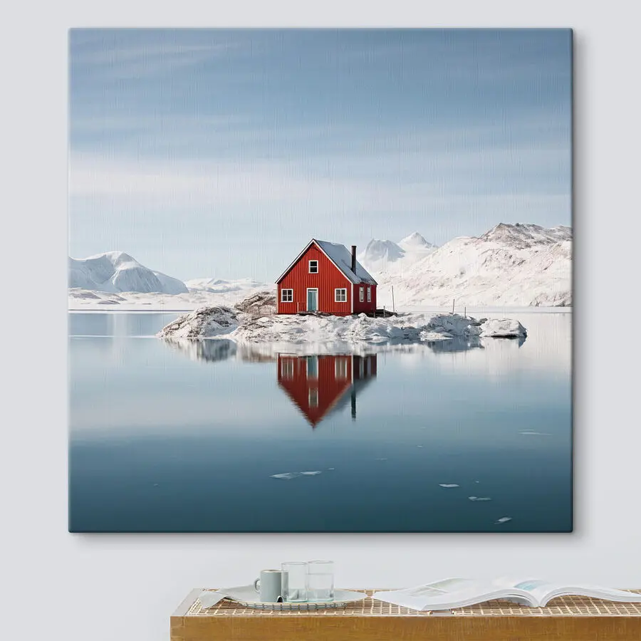 Wandbilder Rotes Haus auf einer Insel im Wasser mit schneebedeckten Bergen im Hintergrund