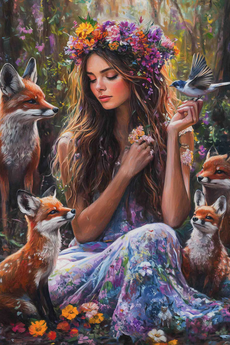 Wandbilder Gemälde einer Frau mit Blumen und Vögeln