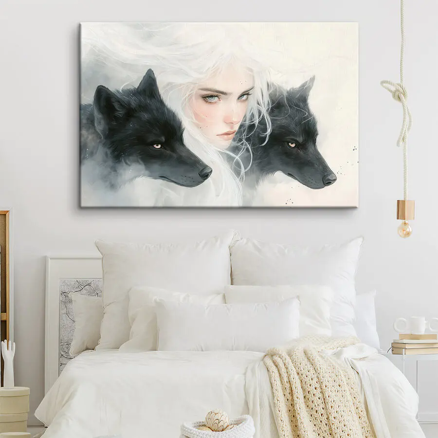 Wandbilder Frau mit weißem Haar und zwei Wölfen