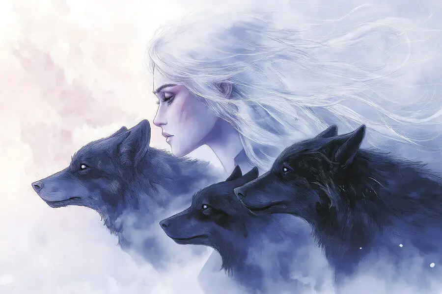 Wandbilder Frau mit weißen Haaren und Wölfen