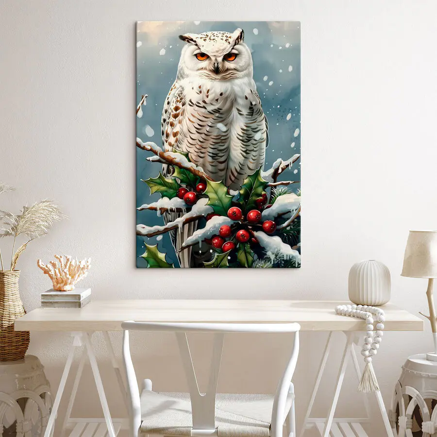 Wandbilder Weiße Eule sitzt auf einem Zweig mit Schnee und Beeren