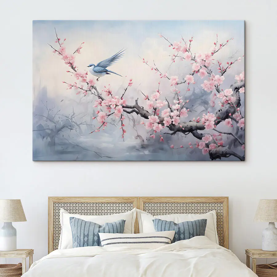Wandbilder Vogel auf einem Zweig mit rosa Blüten