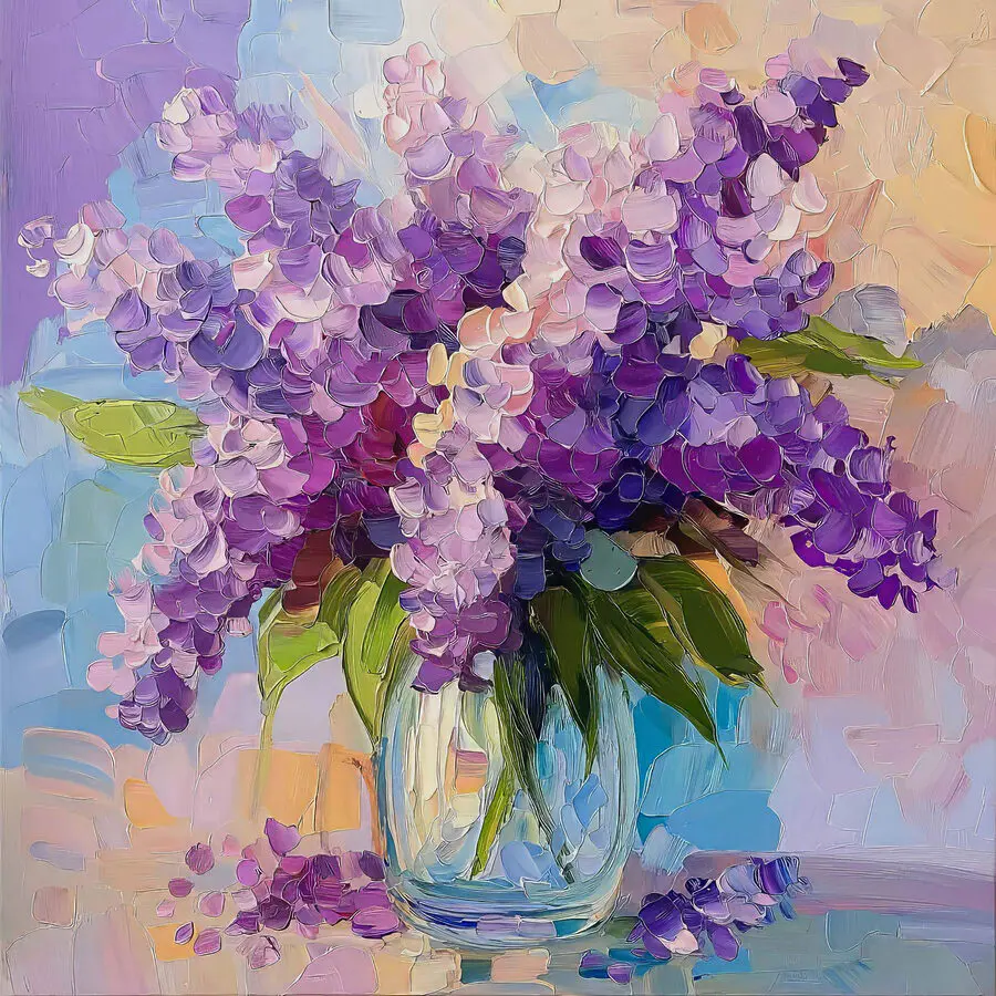 Wandbilder Gemälde mit lila Blumen in einer Glasvase