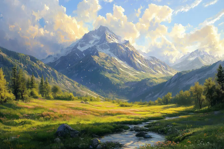 Stellen Sie sich vor, Sie entspannen sich in einer gemütlichen Ecke, eine sanfte Brise weht durch das Fenster, und Ihr Blick fällt auf dieses atemberaubende Bild. Ein Fluss schlängelt sich durch ein üppiges Tal, während im Hintergrund majestätische Berge Wache stehen. Es ist wie ein Mini-Urlaub direkt an Ihrer Wand. Die leuchtenden Grün- und Blautöne laden zu Tagträumen von nachmittäglichen Wanderungen und Picknicks in der Sonne ein, während die Wolken Geschichten von fernen Ländern flüstern. Perfekt für alle, die den Charme der Natur lieben oder ein wenig Ruhe in ihrem Alltag brauchen. Mit diesem Motiv verwandeln Sie jeden Raum in einen ruhigen Rückzugsort - Wanderschuhe sind nicht erforderlich!
