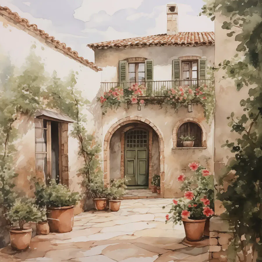 Wandbilder Gemälde eines Hauses mit Topfpflanzen