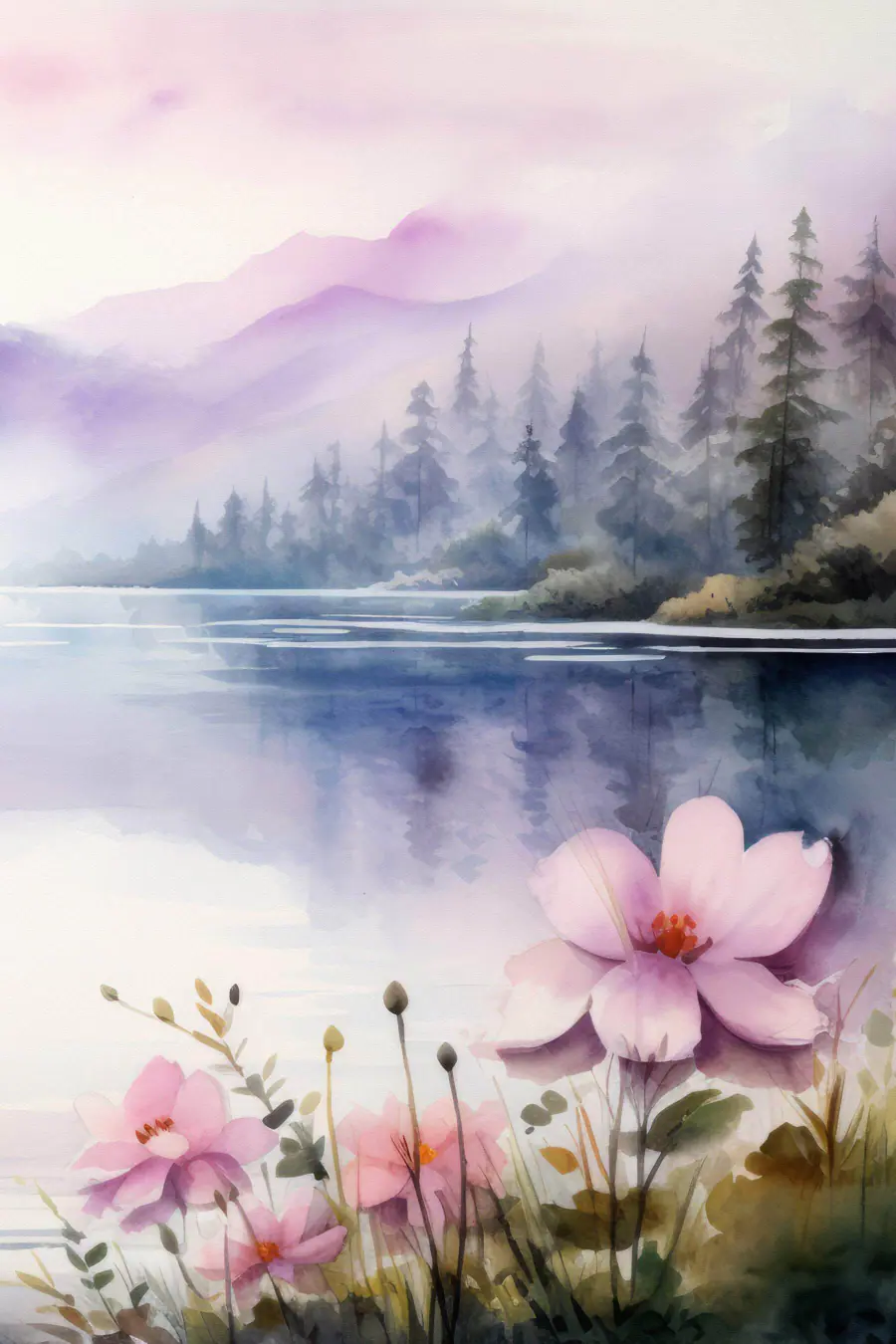 Wandbilder Aquarell von Blumen und Bäumen an einem See