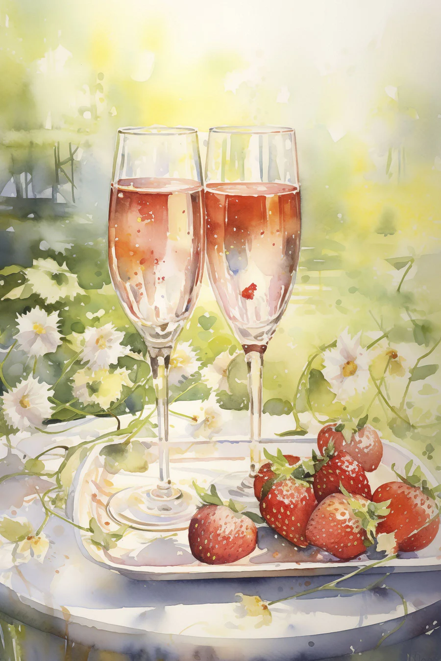 Wandbilder Aquarellmalerei von zwei Gläsern Champagner und Erdbeeren auf einem Tablett