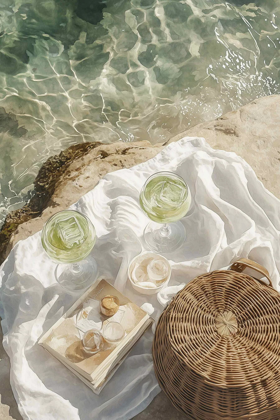 25.01 €15.01 €Wandbilder Aquarellbild von zwei Gläsern Eistee und einem Buch auf einer Decke am Strand