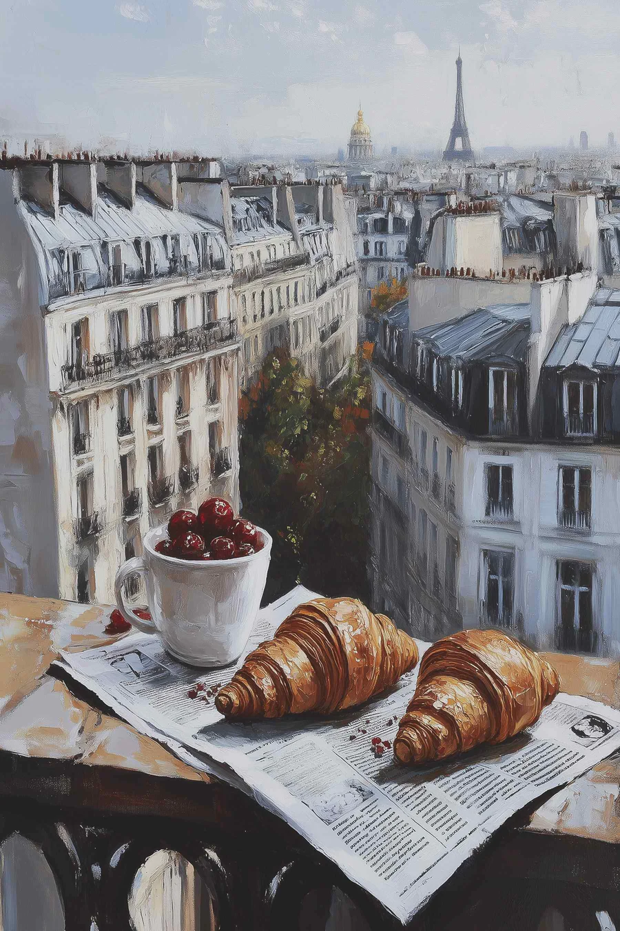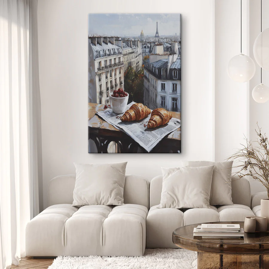Wandbilder Tasse Kaffee und Croissants auf einem Tisch mit Gebäuden im Hintergrund