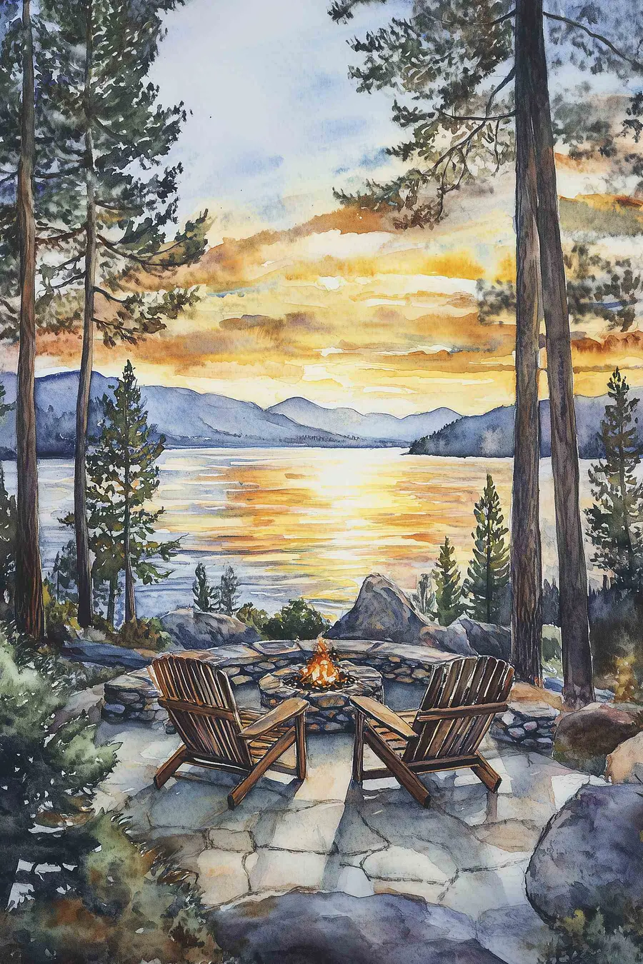 Wandbilder Aquarellmalerei von Stühlen um eine Feuerstelle mit Blick auf einen See